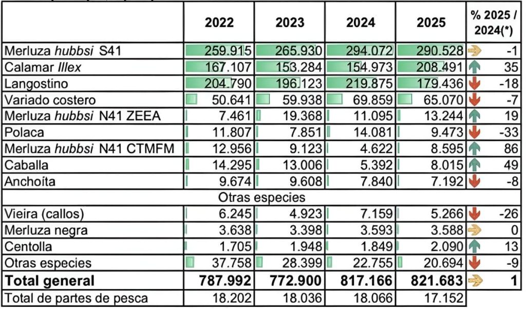 Con datos acumulados hasta el 29 de diciembre, los puertos argentinos registraron un total de 821.682,95 toneladas desembarcadas en 2025, en un año que volvió a mostrar con claridad cuáles fueron las pesquerÃas que sostuvieron la actividad a lo largo del calendario productivo. El volumen anual se explicó principalmente por el desempeño de un grupo reducido de especies, con aportes complementarios de otras pesquerÃas que mantuvieron continuidad operativa en distintos puertos del paÃs, pero con un enorme trabajo mancomunado de gestión desde el Consejo Federal Pesquero y principalmente del Subsecretario de Recursos AcuÃcolas y Pesca de la Nación que con algunas decisiones puntuales pudo revertir una casi inevitable caÃda del 12%, el INIDEP, el sector privado, empresas, gremios y trabajadores.