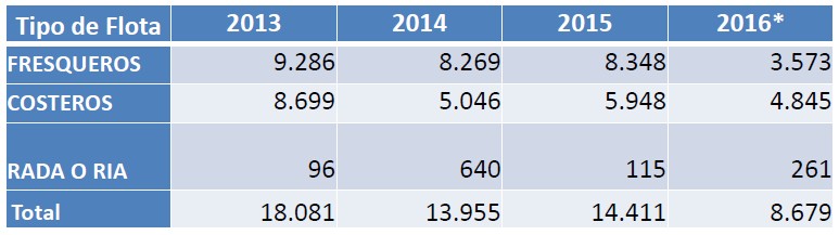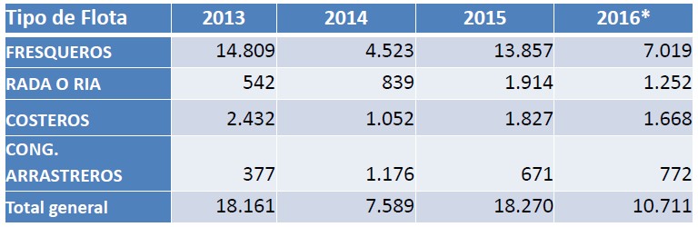 La flota costera declaró descargas por 4.845 toneladas; mientras que los fresqueros, 3.573; y las unidades de rada/ría, apenas 261. Participaron 9 barcos de altura que hicieron 51 viajes; 26 costeros con 137 viajes; y 8 de rada/ría con 38 viajes.