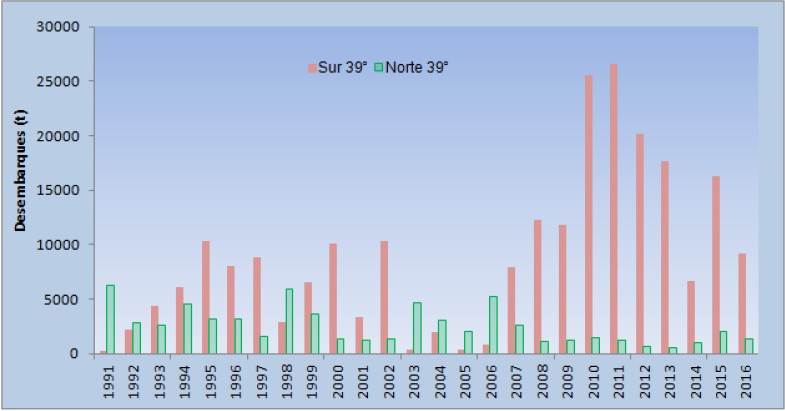 La mayoría de los individuos del stock norteño correspondieron a la clase de edad 2, mientras que los del sur fueron en su mayoría de la clase de edad 3.
