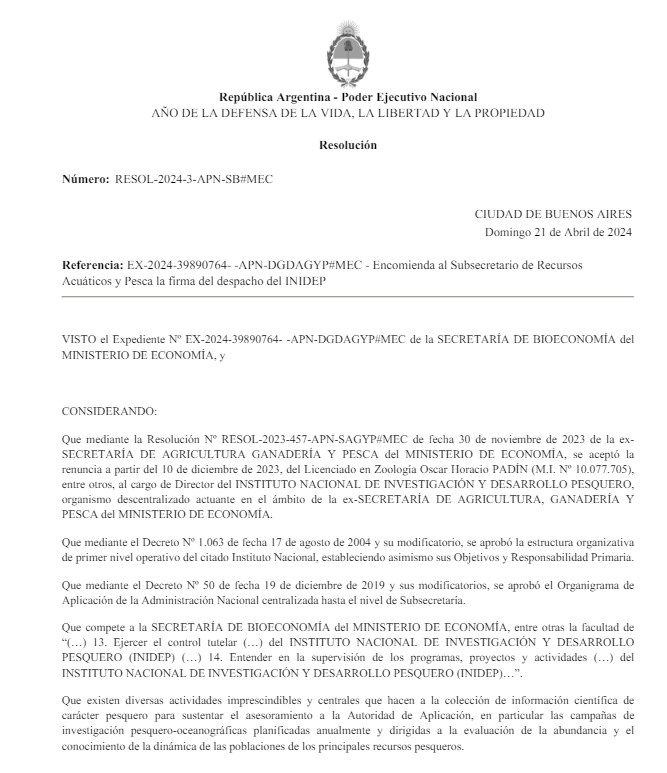 “Que atento la renuncia del Director del aludido Instituto Nacional, resulta necesario para el normal desenvolvimiento de las tareas propias del referido organismo, tal como se viene señalando, encomendar al titular de la SUBSECRETARÍA DE RECURSOS ACUÁTICOS Y PESCA de la SECRETARÍA DE BIOECONOMÍA de MINISTERIO DE ECONOMÍA, el despacho de todos los asuntos relativos al cumplimiento de los objetivos establecidos en el mencionado Decreto Nº 1.063/04”, describe en el mismo sentido la determinación.