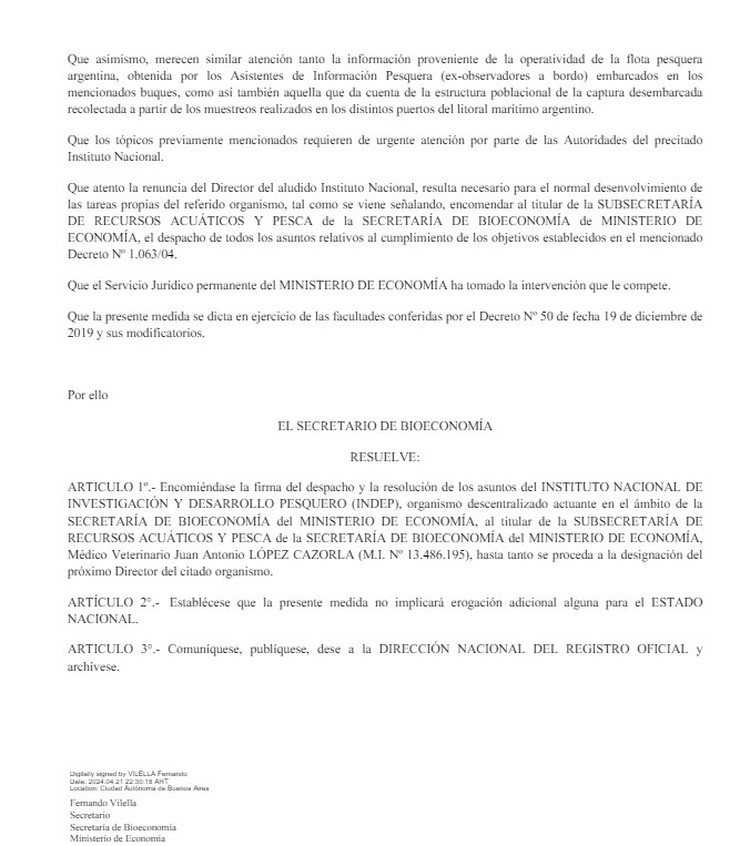 La Resolución que avala la determinación de Fernando Vilella encomienda al Subsecretario de Recursos Acuáticos y Pesca Juan Antonio López Cazorla “la firma del despacho y la resolución de los asuntos del Instituto Nacional de Investigación y Desarrollo Pesquero (INIDEP), organismo descentralizado actuante en el ámbito de la Secretaría de Bioeconomía del Ministerio de Economía, al titular de la Subsecretaría de Recursos Acuáticos y Pesca de la Secretaría de Bioeconomía del Ministerio de Economía, médico veterinario Juna Antonio López Cazorla, hasta tanto se proceda a la designación del próximo Director del citado organismo”, tal cual indica lo rubricado por Vilella.