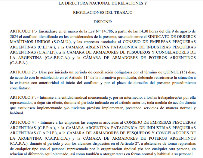 Ayer, 9 de agosto de 2024, a partir de las 14:30 horas, en trámite express debido al casi inexistente tiempo desde que se había dictado el cese de actividades por parte del propio Omar Raúl Durdos y Angel Juan Navarro, se solicitó e inició un período de conciliación obligatoria de quince (15) días en el marco de la Ley 14.786, en relación con el conflicto laboral surgido entre el Sindicato de Obreros Marítimos Unidos (SOMU) y las cámaras empresariales del sector pesquero. Estas cámaras están integradas por el Consejo de Empresas Pesqueras Argentinas (CEPA), la Cámara Patagónica de Industrias Pesqueras (CAPIP), la Cámara de Armadores Pesqueros y Congeladores de Argentina (CAPeCA) y la Cámara de Armadores Poteros Argentinos (CAPA).