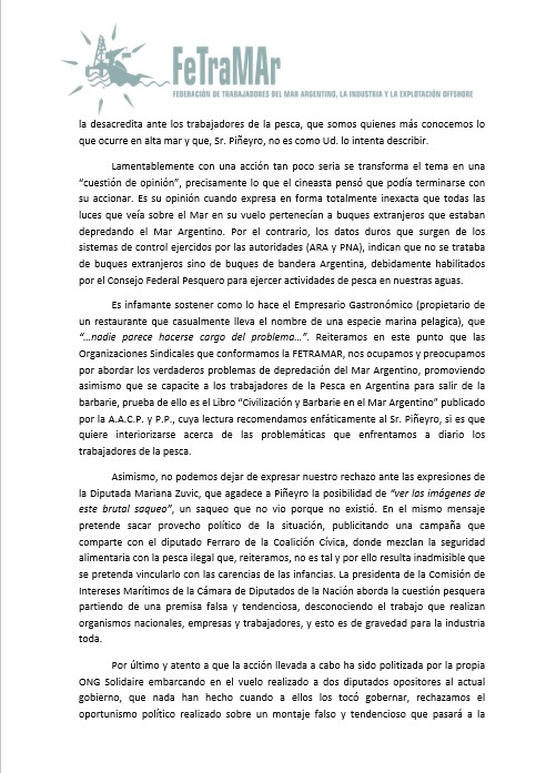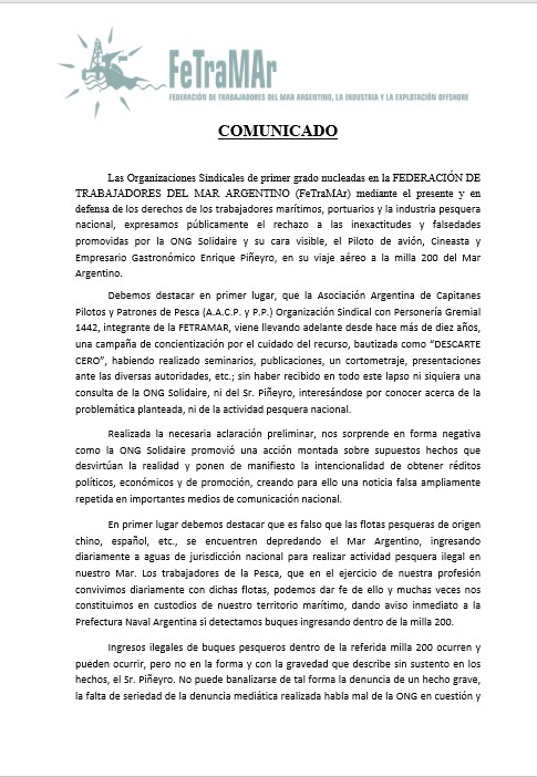 El comunicado indica que “las Organizaciones Sindicales de primer grado nucleadas en la FEDERACIÓN DE TRABAJADORES DEL MAR ARGENTINO (FeTraMAr) mediante el presente y en defensa de los derechos de los trabajadores marítimos, portuarios y la industria pesquera nacional, expresamos públicamente el rechazo a las inexactitudes y falsedades promovidas por la ONG Solidaire y su cara visible, el Piloto de avión, Cineasta y Empresario Gastronómico Enrique Piñeyro, en su viaje aéreo a la milla 200 del Mar Argentino”.