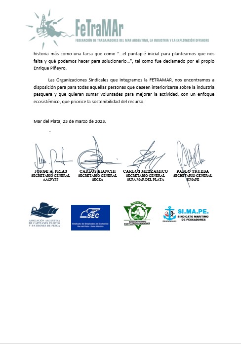 “Es infamante sostener como lo hace el Empresario Gastronómico (propietario de un restaurante que casualmente lleva el nombre de una especie marina pelagica), que ‘…nadie parece hacerse cargo del problema…’. Reiteramos en este punto que las Organizaciones Sindicales que conformamos la FETRAMAR, nos ocupamos y preocupamos por abordar los verdaderos problemas de depredación del Mar Argentino, promoviendo asimismo que se capacite a los trabajadores de la Pesca en Argentina para salir de la barbarie, prueba de ello es el Libro ‘Civilización y Barbarie en el Mar Argentino’ publicado por la A.A.C.P. y P.P., cuya lectura recomendamos enfáticamente al Sr. Piñeyro, si es que quiere interiorizarse acerca de las problemáticas que enfrentamos a diario los trabajadores de la pesca.