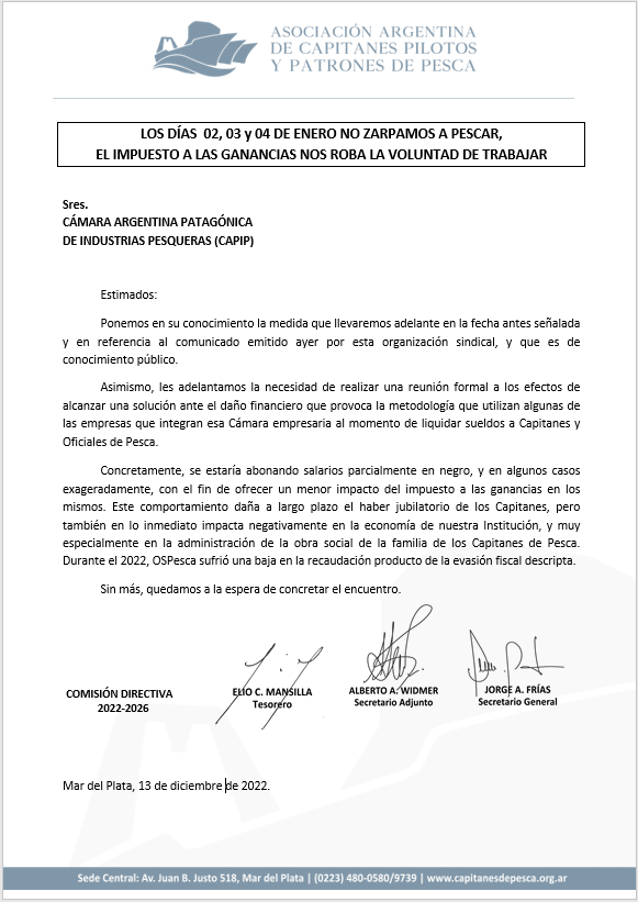 “Finalmente, llevaremos adelante nuestro reclamo que comprende a la totalidad de las tripulaciones de todas las flotas pesqueras, por el término de 72 hs. a partir de las 00:00 del 2 de enero de 2023, amarrados sin salir a producir con los buques y en los muelles y a la espera de ser convocados por las autoridades necesarias ya sea el Presidente de la Nación, el Ministro de Economía o la totalidad de los Legisladores de la Nación y por qué no el Poder Judicial, para brindarles claros detalles y recibir la solución adecuada. En caso de no encontrar respuestas, se profundizarán las acciones gremiales hasta ser escuchados y que se alcance una solución definitiva”.