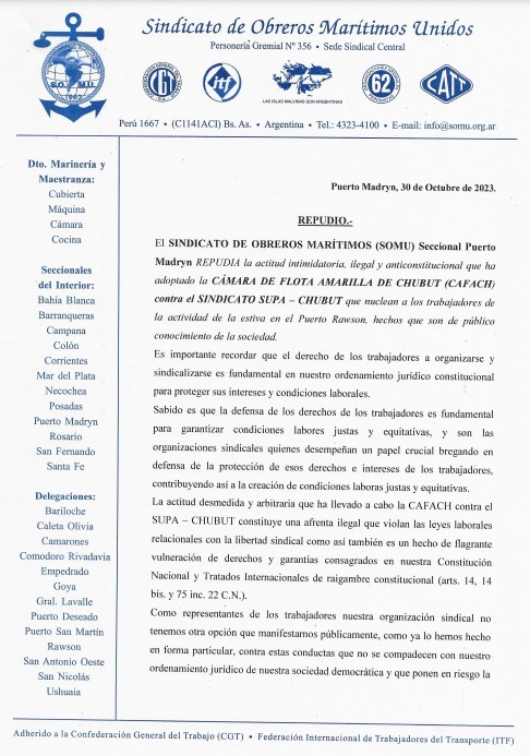 “El Sindicato de Obreros Marítimos (SOMU) Seccional Puerto Madryn REPUDIA la actitud intimidatoria, ilegal y anticonstitucional que ha adoptado la CÁMARA DE FLOTA AMARILLA DE CHUBUT (CAFACH) contra el SINDICATO SUPA – CHUBUT que nuclean a los trabajadores de la actividad de la estiva en el Puerto Rawson, hechos que son de público conocimiento de la sociedad.