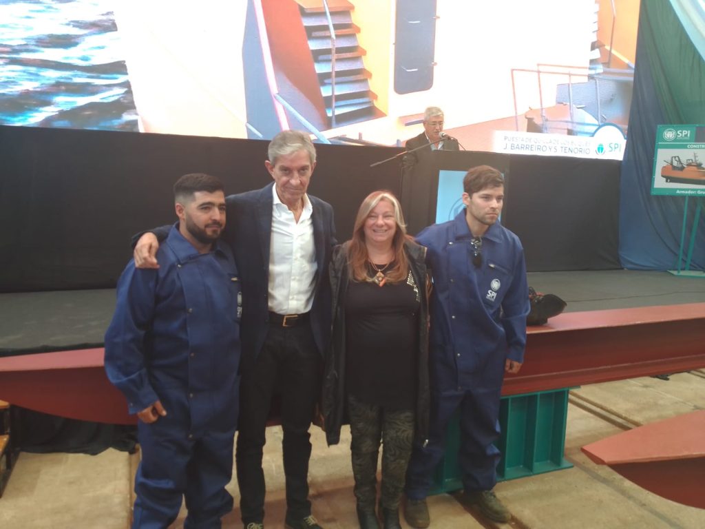 “Tenemos que hacer docencia me dijeron hoy. Yo a veces me niego a la docencia, porque hemos hablado tanto y hemos defendido tanto la industria que me resulta a veces difícil volver a empezar, pero necesito convocar a todos estos jóvenes que están atrás (en alusión a los trabajadores del astillero que participaron del acto), que el sustento de empresarios como Fernando, para seguir velando por las construcciones aquí en la Argentina, construcciones de barcos argentinos, construidos por argentinos. Tenemos que poner en valor, en mucho valor, con mucho amor, con mucha pasión, batallamos hace muchos años que dicen que nuestra materia gris se va, hoy tenemos una oportunidad, hoy Conarpesa nos estamos una dando oportunidad de que nosotros, esa materia gris, nos quede acá, pero no es suficiente para la industria naval que tiene que defender conceptualmente la producción nacional y la industria nacional, y sobre todo la naval, aquella que además es virtuosa, porque estos barcos además que van a generar un proceso constructivo industrial productivo en sí mismo, es un bien de capital, que Conarpesa le va a agregar valor a través de la pesca y el empleo que hace en la zona. Y además vamos a tener la suerte de repararlos nosotros”, conminó la presidenta de SPI al empresario entre risas.