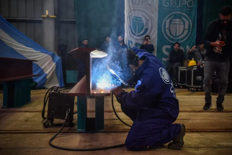 Previo a la soldadura de las monedas en cada una de las quillas, que simbolizan la construcción de la nave sobre ellas, la que fue realizada por los dos soldadores aprendices más jóvenes para realizar la tarea, que recayó en las manos de David Silva y Damián del Castillo, la presidenta del astillero SPI, Sandra Cipolla pronunció un discurso alentador y esperanzador luego del anuncio de Ãlvarez Castellano.