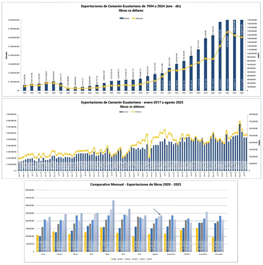Los datos de 2025 confirman el liderazgo global de Ecuador como primer exportador de camarón del mundo, sustentado en su capacidad productiva, eficiencia logística y diversificación de mercados.