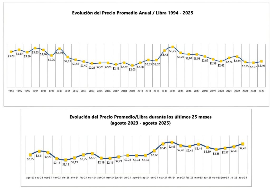 Pese al dinamismo general, el mes de agosto mostró una leve moderación. Las exportaciones totalizaron 107.430 toneladas, apenas un 3% por encima de las cifras de 2024, aunque con un incremento del 13% en valor, equivalente a 581 millones de dólares.