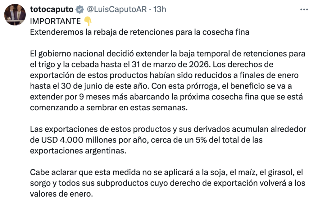 鈥Extenderemos la rebaja de retenciones para la cosecha fina鈥, public贸 Caputo en su cuenta de la red social X. Con esta decisi贸n, el Gobierno busca acompa帽ar el ciclo productivo de estos cultivos, cuya siembra ya est谩 en marcha, y sostener un flujo de exportaciones que ronda los 4.000 millones de d贸lares anuales, lo que representa cerca del 5% del total de las exportaciones argentinas.