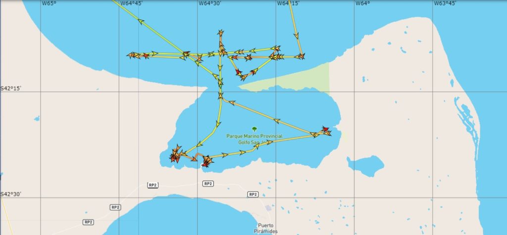 El BIP Mar Argentino, permaneció hasta ayer, al refugio, mientras la flota comercial lo hacía en el Sudeste del Golfo San Matías al norte de la península de Valdés donde se acumularon algo más de 10 buques que estaban operando a merluza sobre el paralelo 42 a 80 millas al Este del lugar.
