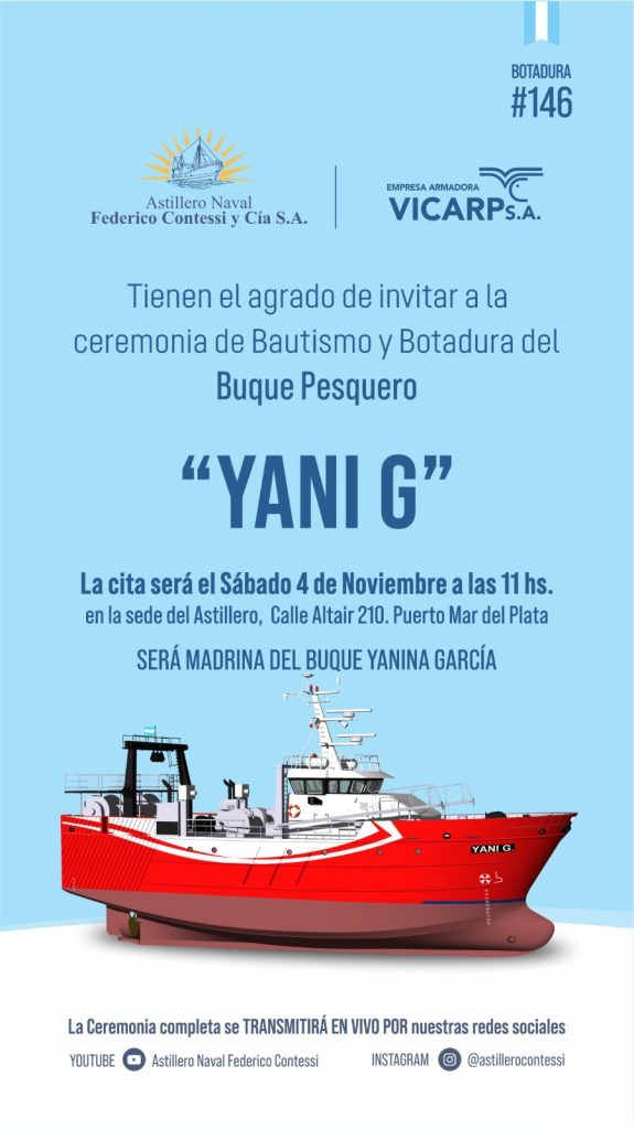 La nueva convocatoria es a la hora 11, donde la empresa armadora “VICARP S.A.”, botará el “YANI G”, poniendo en el Mar Argentino otra moderna y confortable embarcación.