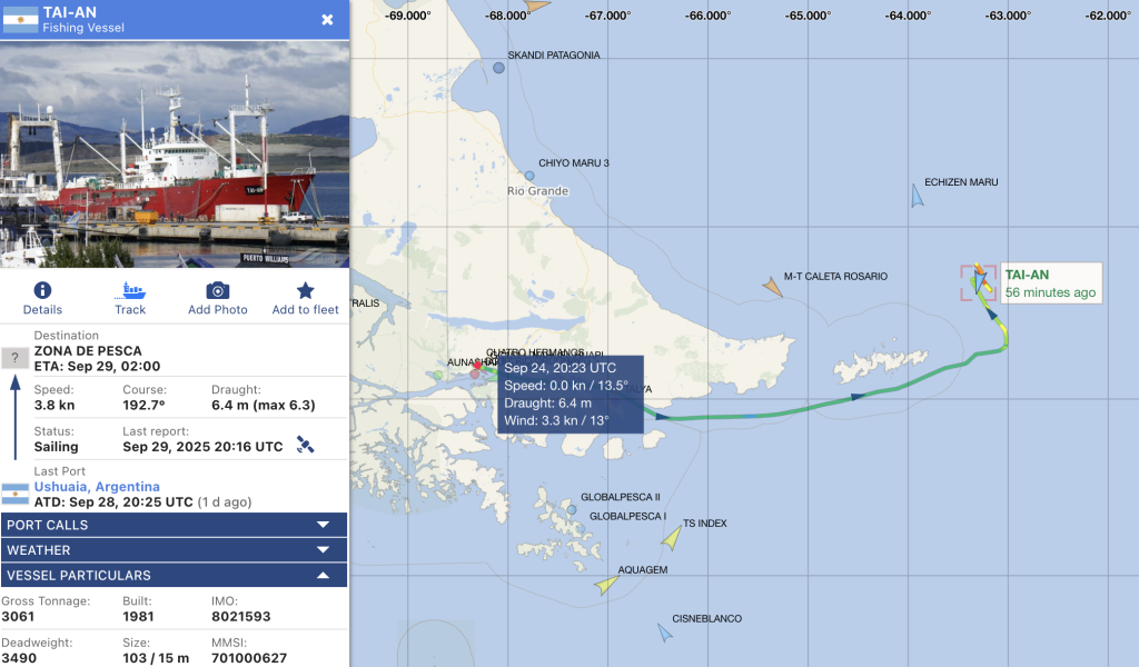 Contra todo pron贸stico y pese a los incumplimientos salariales denunciados por su tripulaci贸n, el BP Tai-an, propiedad de la empresa Prodesur S.A., zarp贸 este domingo 28 de septiembre desde el puerto de Ushuaia.