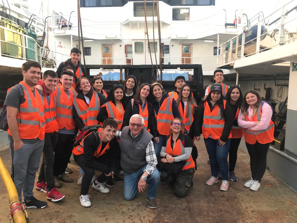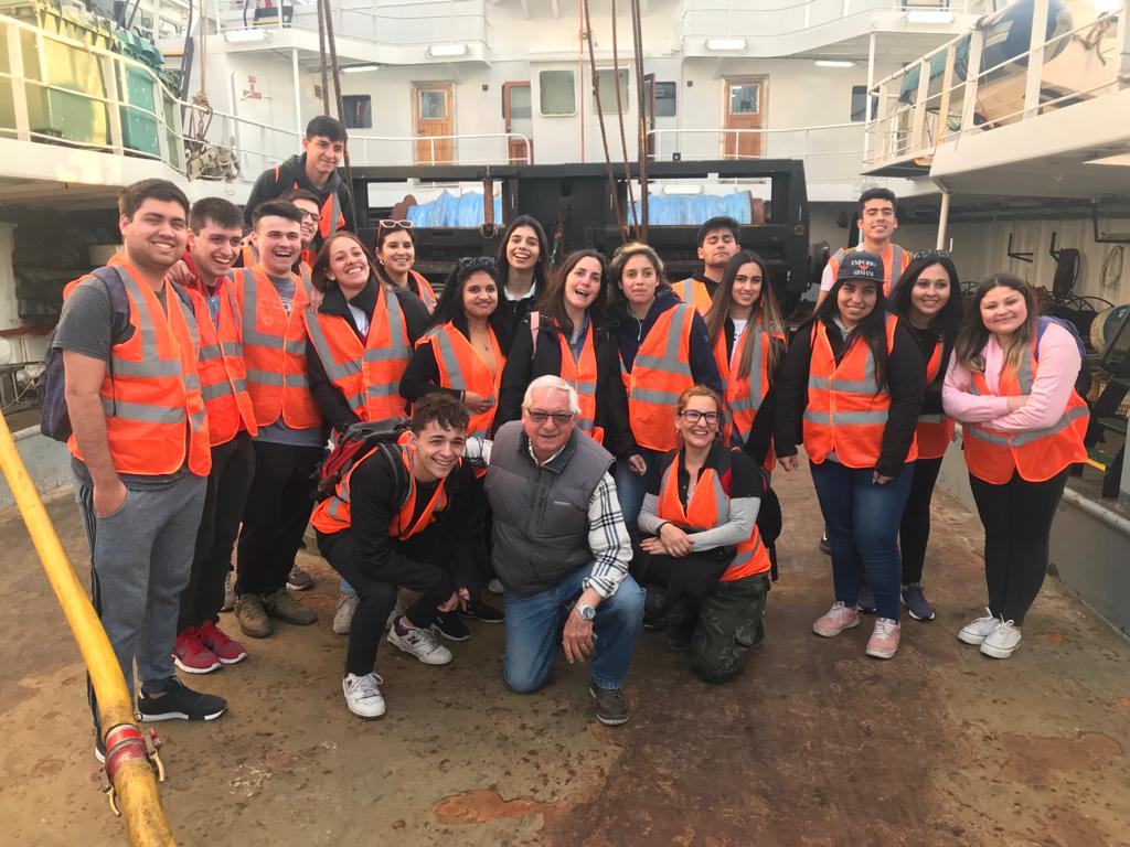 Rubén Aguero fue quien recibió a los alumnos universitarios, quienes pudieron pisar sector por sector los 79 metros de eslora del congelador arrastrero “Ponte de Rande”.