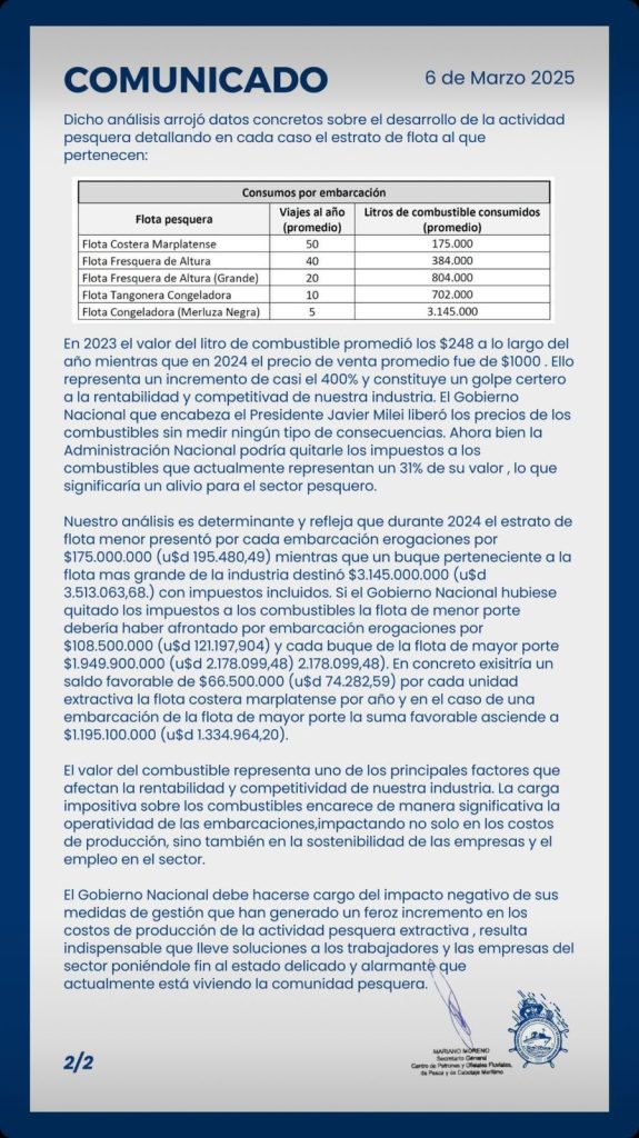 Según el propio informe, «por ejemplo, una embarcación de la flota costera marplatense tuvo en 2024 erogaciones por $175.000.000 (USD 195.480), mientras que un buque de la flota congeladora de merluza negra destinó $3.145.000.000 (USD 3.513.063). Según los cálculos del gremio, si el gobierno nacional hubiese eliminado los impuestos a los combustibles, la reducción de costos por unidad extractiva habría sido de hasta $66.500.000 anuales en el caso de la flota costera «.