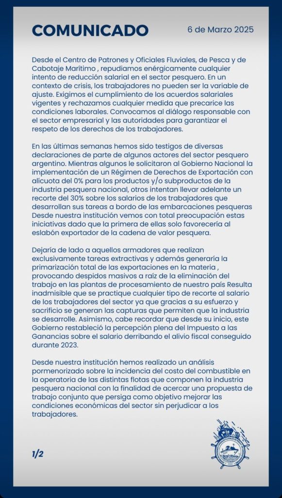 El Centro de Patrones y Oficiales Fluviales, de Pesca y de Cabotaje Marítimo emitió un comunicado en el que manifiesta su enérgico rechazo a cualquier intento de reducción salarial en el sector pesquero. «En un contexto de crisis, los trabajadores no pueden ser la variable de ajuste«, expresaron desde la entidad, al tiempo que exigieron el cumplimiento de los acuerdos salariales vigentes y rechazaron cualquier medida que implique la precarización de las condiciones laborales.