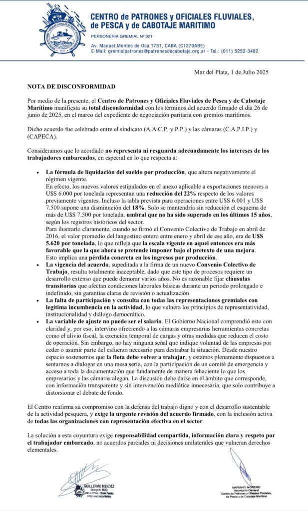 El Centro de Patrones y Oficiales Fluviales de Pesca y de Cabotaje MarÃtimo expresó su “total disconformidad†con los términos del acuerdo paritario alcanzado el 26 de junio entre Asociación Argentina de Capitanes, Pilotos y Patrones de Pesca (AACPyPP) y las cámaras empresarias CAPIP y CAPeCA, en el marco de las negociaciones salariales del sector marÃtimo-pesquero.