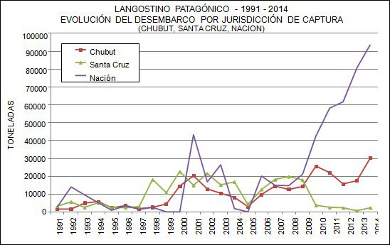 Con una mirada un tanto más retrospectiva, se puede advertir que en el perÃodo 1991-2014 se declaró un desembarco total de langostino proveniente del área patagónica de 1.032.600 toneladas, siendo más de la mitad (aproximadamente 653.000 t.) registrado en los últimos 9 años.