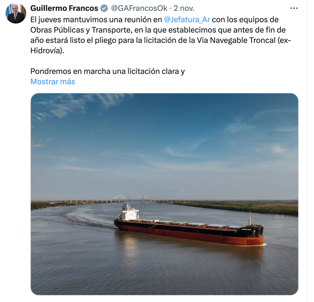 El Jefe de Gabinete de Ministros de la Nación, Guillermo Francos, anunció que el pasado jueves en una reunión en la Jefatura de Gabinete, junto a los equipos de Obras Públicas y Transporte, que se prevé la finalización del pliego para la licitación de la Vía Navegable Troncal (ex-Hidrovía) antes de que finalice el año.