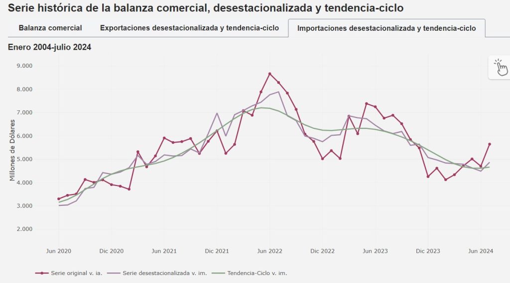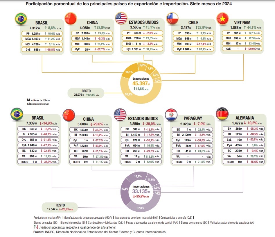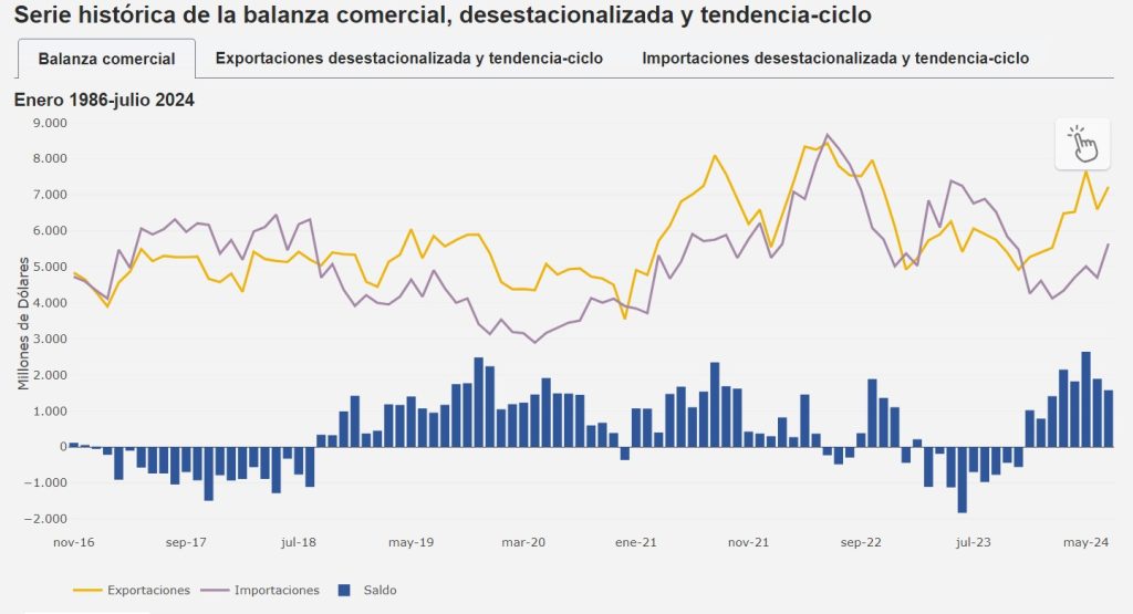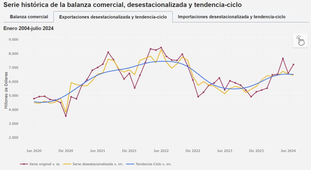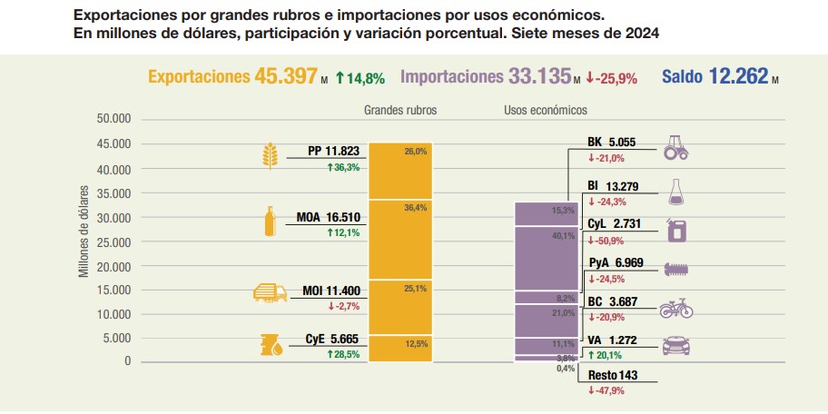 - Exportaciones: Alcanzaron un total de 7.221 millones de dólares, representando un incremento del 19,2% en comparación con julio de 2023. Este crecimiento fue impulsado principalmente por un aumento del 25,5% en las cantidades exportadas, mientras que los precios registraron una disminución del 5,1%.