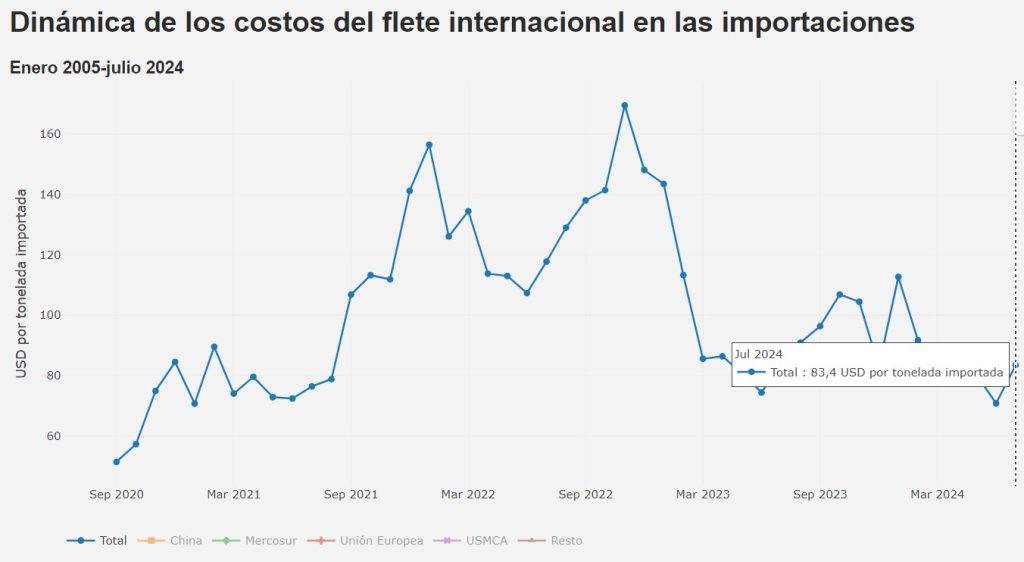 El costo promedio del flete internacional en julio de 2024 fue de 83,4 dólares por tonelada, registrando una leve disminución del 0,5% respecto al año anterior y una caída más pronunciada del 29,1% en comparación con julio de 2022. Las regiones que más influyeron en estos costos fueron China, el Mercosur y la Unión Europea, que concentraron el 72,3% del total.