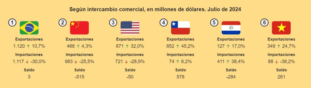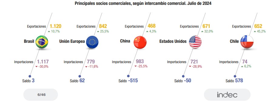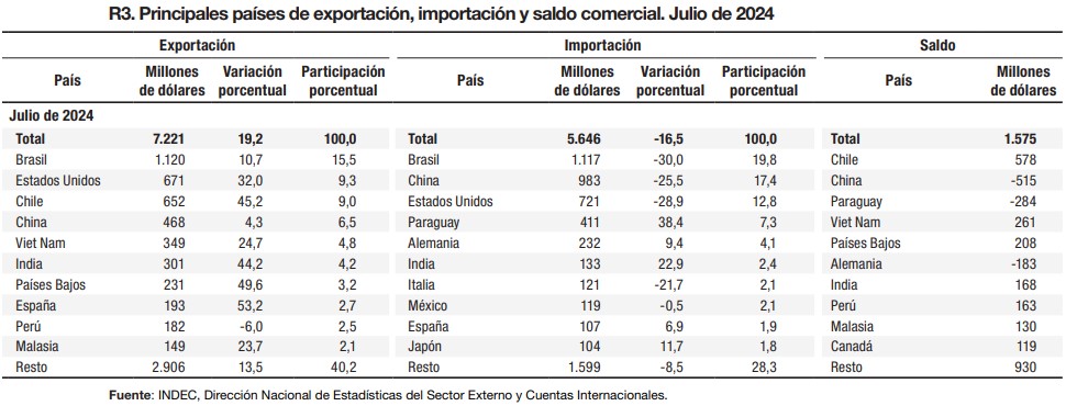 Gracias al aumento de las exportaciones y la reducción de las importaciones, el saldo comercial de julio fue superavitario en 1.575 millones de dólares, revirtiendo el déficit de 700 millones de dólares registrado en julio de 2023.