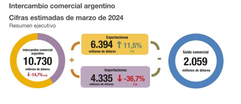 El mes de marzo cerró con un superávit comercial de 2.059 millones de dólares para Argentina. Este resultado se debió a la recuperación en las exportaciones y una caÃda en las importaciones, consolidando la tendencia positiva iniciada en diciembre de 2023. Aunque se observó un ligero deterioro del 1,2% en los términos del intercambio, el aumento en las cantidades exportadas y la reducción en las importadas fueron los principales impulsores de este logro. Asà lo demuestra el Informe oficial del INDEC que refleja el Intercambio Comercial Argentino del mes de marzo 2024.