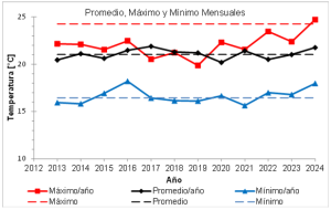 En el comparativo de los datos estadísticos mensuales principales con los calculados a partir del registro completo de la serie de la Estación desde el 2013 al presente, durante enero de 2024 se registró el máximo mensual absoluto de la serie que arrojó 24,7°C, además del aumento de todas las medidas estadísticas principales, con apartamientos promedio de 0,9°C y de 1,6° en el mínimo, de acuerdo a lo informado por el Instituto.