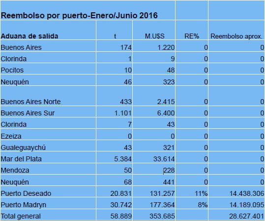 Dentro de este esquema, las exportaciones realizadas desde Puerto Madyn y Deseado (51.573 t.) obtuvieron reembolsos por 28,6 millones de dólares, un beneficio que Mar del Plata carece. En cualquier caso, por este puerto salieron 5.384 toneladas.