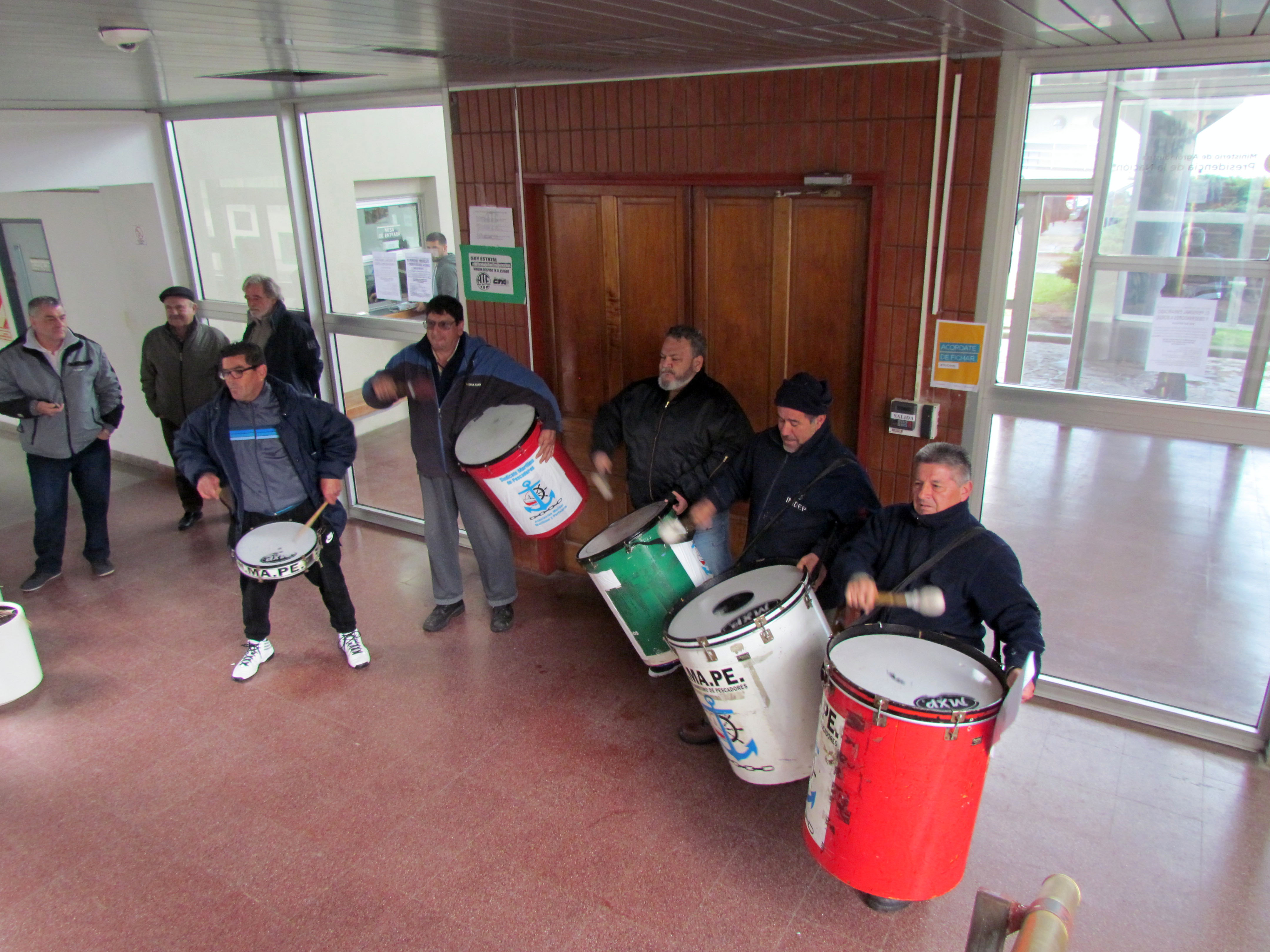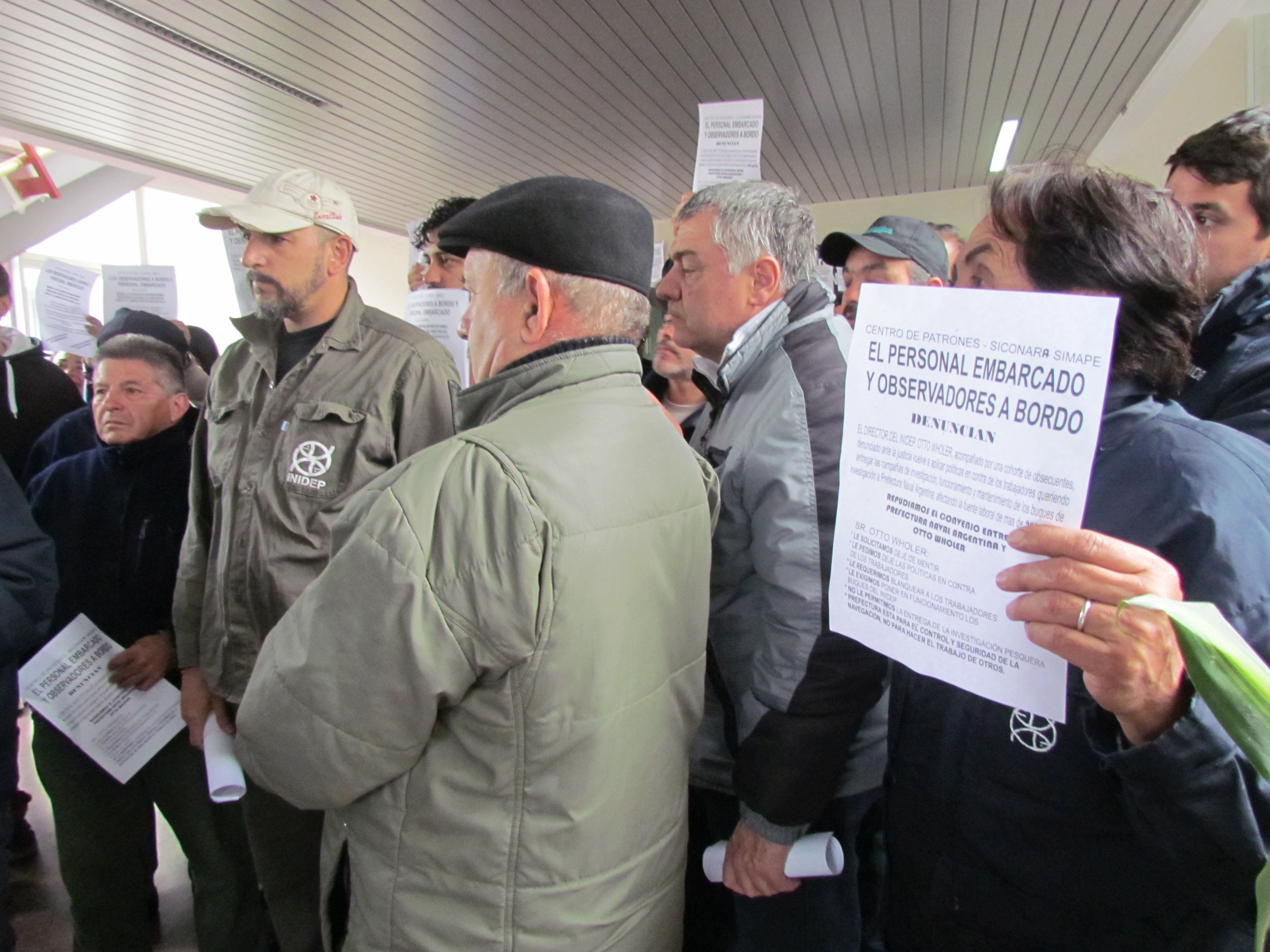 La inquietud de los sindicatos se manifestó en la mañana de este martes en el hall del Inidep. Representantes del Simape, Siconara y Centro de Patrones montaron una protesta con bombos, banderas y duras críticas al director del Inidep, Otto Wöhler.