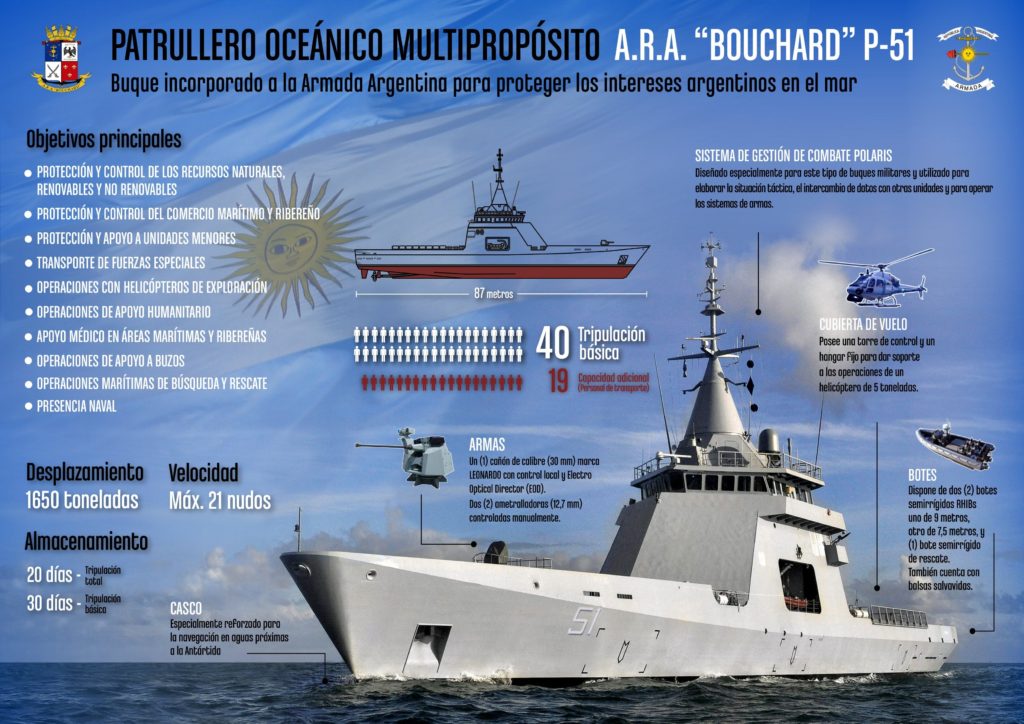 El “ARA Bouchard” es una embarcación usada, construida en 2011 y renovada en los últimos meses. Fue adquirida por el Estado argentino, durante la gestión de Mauricio Macri, al astillero francés Naval Group en el marco un proyecto para recuperar herramientas de control.