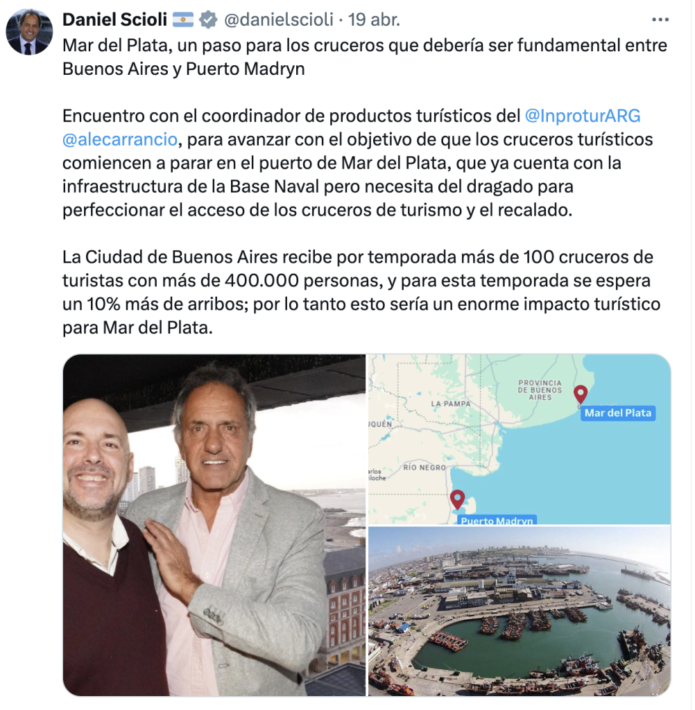 “Mar del Plata, un paso para los cruceros que debería ser fundamental entre Buenos Aires y Puerto Madryn”, escribió Scioli, quien destacó que la ciudad ya dispone de la infraestructura necesaria en la Base Naval. Sin embargo, aclaró que para que los cruceros turísticos puedan operar en condiciones óptimas, es necesario concretar tareas de dragado que faciliten el acceso y el amarre de estas embarcaciones, pero sobre todo que la Nacion se haga cargo de financiar estos megaproyectos cuyo destino es mas resonante que real y operativo.