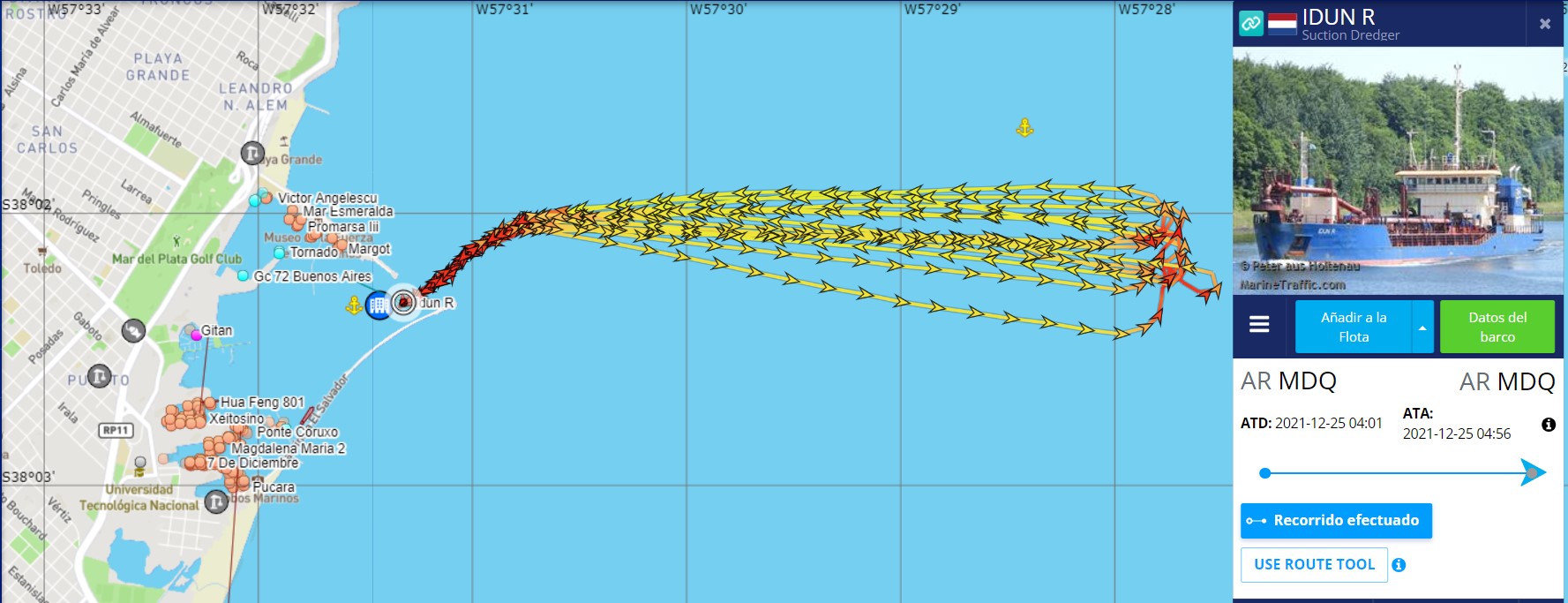 Hay que destacar, que desde casi el anonimato y el silencio, se divisa en la boca del puerto, entre escolleras, la silueta de la draga IDUN R, que noche y día “está haciendo un trabajo FENOMENAL e inédito para el puerto”, nos decían desde la tripulación del Gitan, que de paso, mide la batimetría y el perfil del fondo marino y sabe como trabaja este equipo de 7 personas en una draga que a veces “hasta parece hundirse” con un franco bordo de no más de 70cm.
