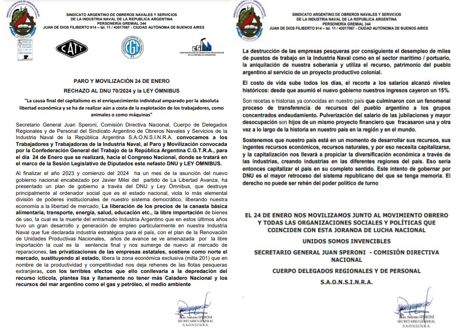 “Secretario General Juan Speroni, Comisión Directiva Nacional, Cuerpo de Delegados Regionales y de Personal del Sindicato Argentino de Obreros Navales y Servicios de la Industria Naval de la República Argentina S.A.O.N.S.I.N.R.A. convocamos a los Trabajadores y Trabajadoras de la Industria Naval, al Paro y Movilización convocada por la Confederación General del Trabajo de la República Argentina C.G.T.R.A., para el día 24 de Enero que se realizará, hacia el Congreso Nacional, donde se tratará en el marco de la Sesión Legislativo de Diputados este nefasto DNU y LEY OMNIBUS.”