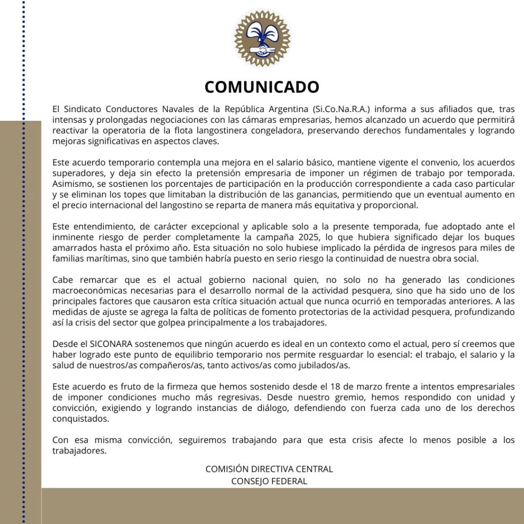 Tras más de tres meses de conflicto y prolongadas negociaciones, el Sindicato de Conductores Navales de la República Argentina (SICONARA) anunció la firma de un acuerdo con las cámaras empresarias, que permitirá reanudar —por su parte— la operatoria de la flota tangonera congeladora en el marco de la temporada de pesca de langostino 2025 en aguas nacionales.