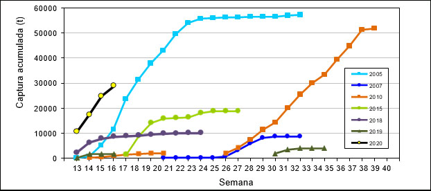 Se registraron muy buenos rendimientos semanales promedio (39-30 t/día) durante las cuatro primeras semanas de la temporada de pesca en la UM Norte, valores que están muy por encima de los registrados durante los años tomados como referencia.