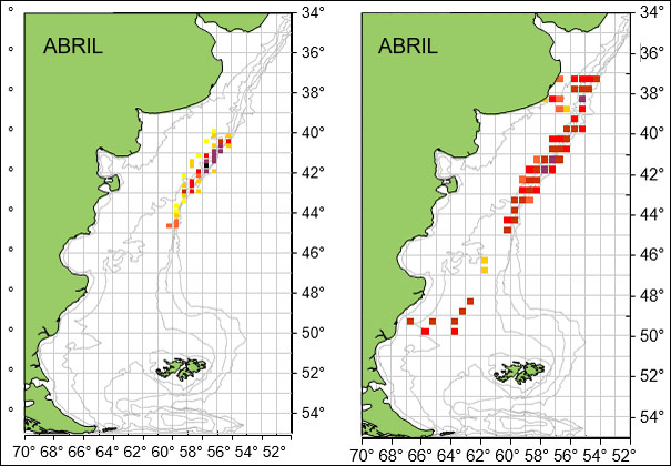 Entre el 1° y el 28 de abril, 56 buques poteros pescaron 28.910 toneladas (34,92 t/día), operando mayoritariamente sobre la plataforma externa, entre los paralelos 40°S y 43°S.