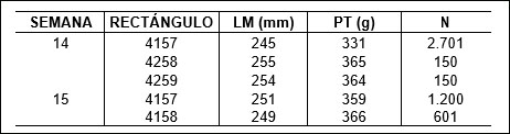 Los resultados muestran que las capturas obtenidas estaban conformadas por calamares con longitudes entre 20 y 30 centímetros LM (LMmedio = 248 mm; PTmedio = 344 g).