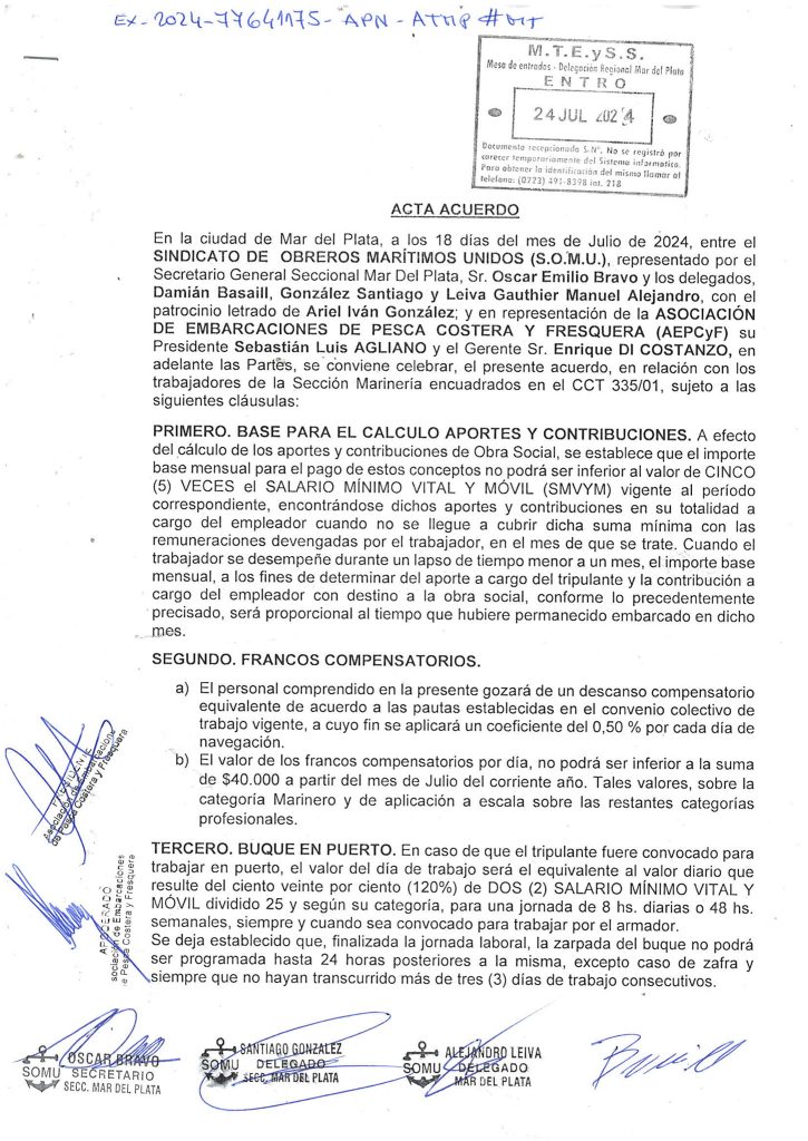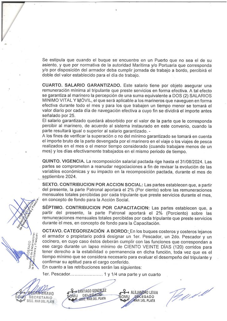 El Sindicato de Obreros Marítimos Unidos (SOMU) y la Asociación de Embarcaciones de Pesca Costera y Fresquera (AEPCyF) han firmado un nuevo acuerdo salarial que introduce una recomposición de valores fijos y mejoras en el convenio actual. Este acuerdo, firmado la semana pasada, estará vigente hasta el 31 de agosto, y las partes se han comprometido a reanudar las negociaciones y monitorear las variables económicas para evaluar su impacto en la recomposición pactada.