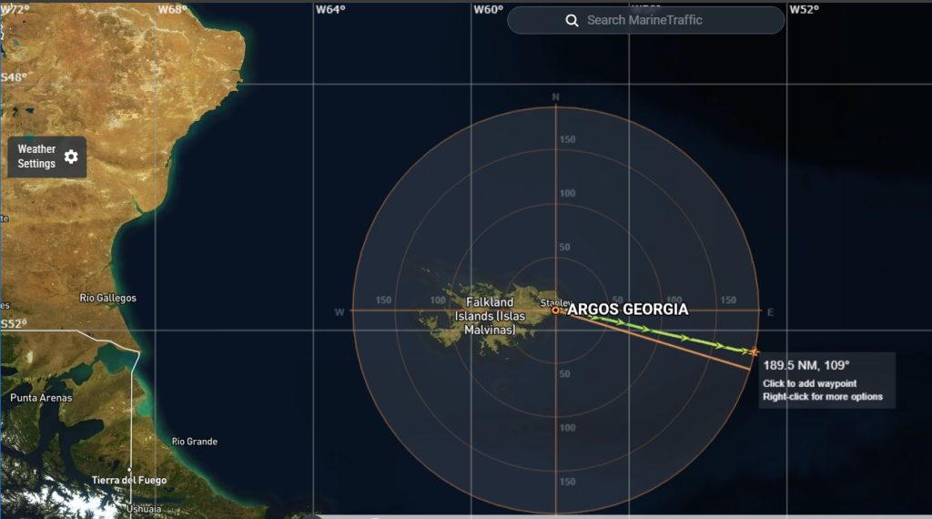 En la tarde de ayer lunes, la Autoridad Marítima de las Islas Malvinas recibió una llamada de emergencia por parte del pesquero Argos Georgia, un buque palangrero de una empresa británica-noruega dedicado a la pesca de merluza negra, de 54 metros de eslora y 13 de manga, reportó una ruptura en su casco y la consecuente entrada de agua de mar. El incidente ocurrió a 189.6 millas náuticas al Este de Puerto Argentino, provocando la activación inmediata de una misión de búsqueda y rescate (SAR).