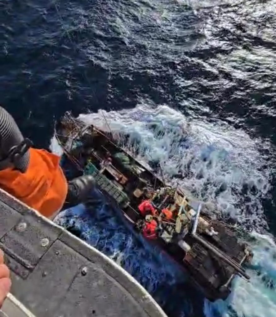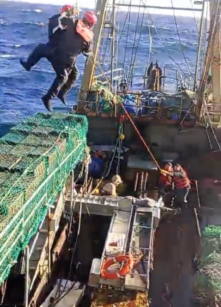 Un helicóptero con un médico a bordo despegó desde la Estación Aérea Mar del Plata. La aeronave voló hasta el buque pesquero, donde realizó una maniobra precisa para descender una canasta sanitaria e izar al tripulante en un entorno hostil que propinaba una dinámica compleja.