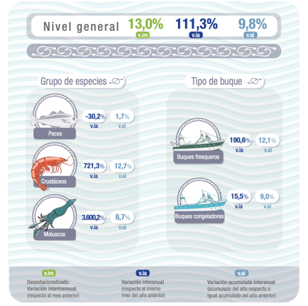 En contraste, el grupo Moluscos mostr贸 un crecimiento del 12,0% en comparaci贸n con enero de 2024, lo que represent贸 una incidencia positiva del 3,1% en la variaci贸n del nivel general del 铆ndice como consecuencia de un mes de enero, casi explosivo en capturas de calamar illex, con varios poteros que completaron en mareas de 23 d铆as efectivos de pesca y descargaron antes del 22 de ese mes.