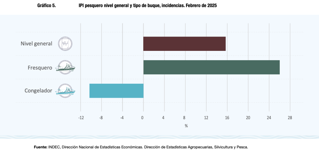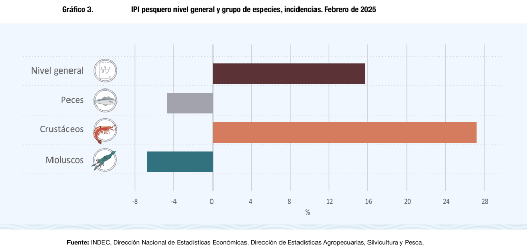 Seg煤n datos del Instituto Nacional de Estad铆stica y Censos (INDEC), el 铆ndice de producci贸n industrial pesquero (IPI pesquero) registr贸 en febrero de 2025 un crecimiento del 15,7% en comparaci贸n con el mismo mes del a帽o anterior. No obstante, la serie desestacionalizada muestra una baja del 5,5% respecto a enero, mientras que la serie tendencia-ciclo marc贸 una suba de 1,4%. Ver IPI Febrero 2025.