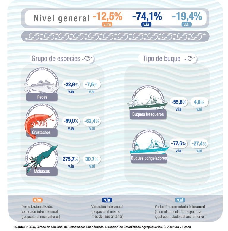 Este desplome marca la peor performance dentro de la industria manufacturera, con un impacto negativo acumulado del 19,4% en el primer semestre del a帽o. La principal causa fue el conflicto gremial que paraliz贸 la actividad pesquera, especialmente la del langostino en el segmento congelado a bordo, que representa el grueso de los crust谩ceos y cuyo 铆ndice de producci贸n cay贸 un 99% en el mes.