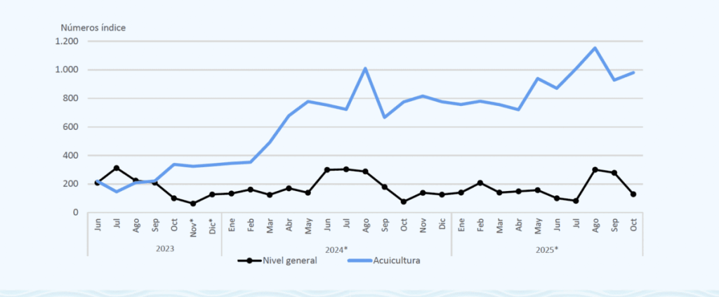 Mientras la pesca mar铆tima altern贸 altibajos, la acuicultura sigui贸 creciendo sin interrupciones. En octubre avanz贸 26,4% interanual y ya acumula 35,3% en lo que va del a帽o. Es el 煤nico sector del 铆ndice que muestra estabilidad y expansi贸n continua, tanto en volumen como en ritmo de producci贸n, algo plenamente calculado porque a煤n es incipiente su desarrollo teniendo un techo por ahora muy lejos de alcanzarlo.