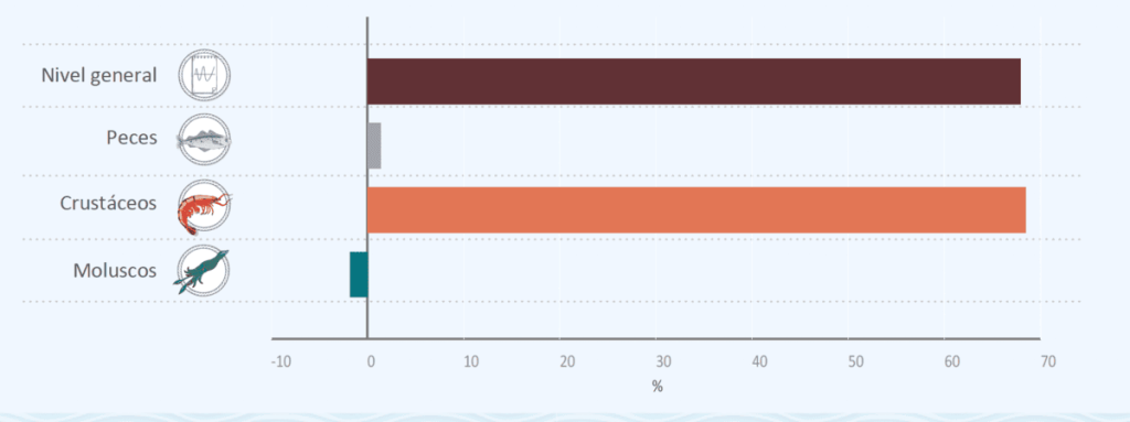La variaci贸n m谩s extrema del informe aparece en el grupo de crust谩ceos, donde se registr贸 un aumento de 6.712,5% interanual. En los hechos, esto remite al langostino, que ven铆a de una base excepcionalmente baja el a帽o anterior por cierre anticipado de temporada y este octubre, producto del desfasaje temporal por tema gremial, mostr贸 un crecimiento puntual en disponibilidad y capturas.