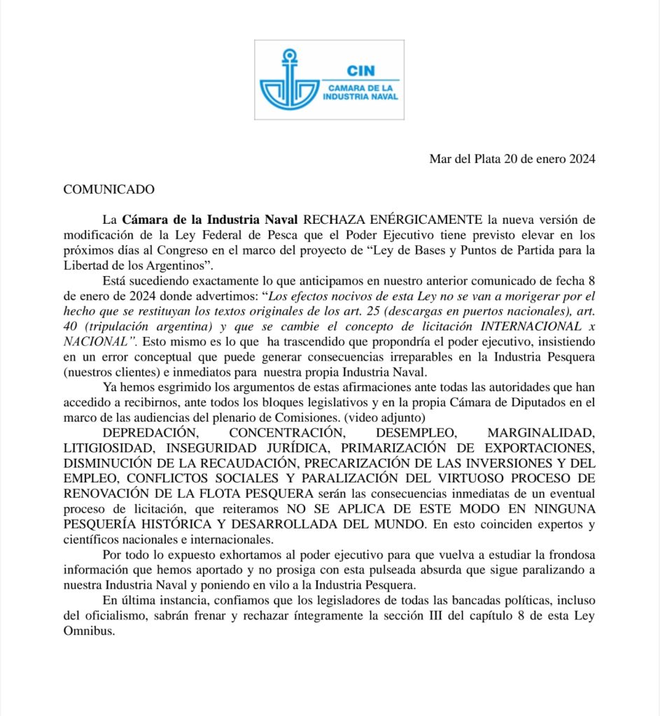 “La Cámara de la Industria Naval RECHAZA ENÉRGICAMENTE la nueva versión de modificación de la Ley Federal de Pesca que el Poder Ejecutivo tiene previsto elevar en los próximos días al Congreso en el marco del proyecto de «Ley de Bases y Puntos de Partida para la Libertad de los Argentinos».