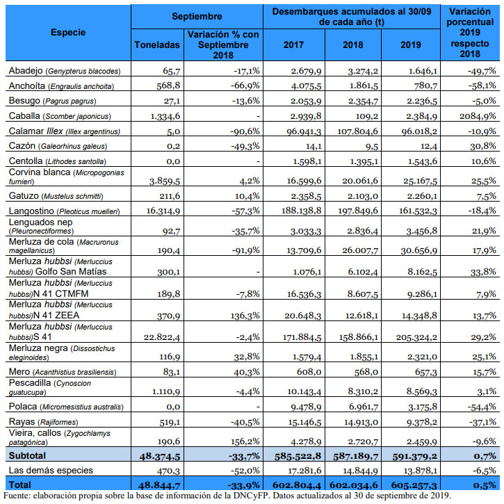 El sector encara el último tramo del año con desembarques estabilizados en términos generales. Entre enero y septiembre se declararon descargas por 605.257 toneladas, apenas un 0,5 por ciento más en comparación con el mismo período de 2018.