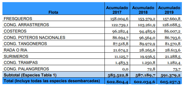 Sin embargo, en el cuadro destaca la caída de langostino (161.532 toneladas / -18,4 por ciento) y el menor volumen de calamar (96.018 toneladas / -10,9 por ciento), aunque con merluza en alza (205.324 toneladas del Stock Sur / +29,2 por ciento y 14.348 del Norte / +13,7 por ciento).